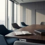 Salle de réunion d’entreprise vide, table en bois avec carnet ouvert et code juridique, symbolisant la responsabilité de l’employeur et la prévention des risques au travail.